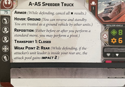 Duck and Cover is the only training upgrade I would truly recommend on Pathfinders. They are by nature a defensive unit and you want to play to their strengths. This upgrade will allow you to get those 3 extra defense dice by the second time they get shot (or sooner depending on command card choices or other tricks) and once that happens they can be tanky. A-300, obviously, because it’s a free gun. I start the game in the range 4 config 100% of the time as this unit really does not want to be at range 2 until very late in the game. Prepared Supplies is a recent addition to my “bare minimum” loadout, but as dice pools get bigger it can help you weather that first shot so you can stick around and be annoying until the end.