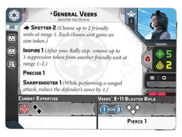 To return to our previous discussion, more aim tokens aren’t a bad idea. Unfortunately Veer’s command cards do little for our furry friends, but spike damage is incredibly powerful in Legion. The Imperial Officer and other units with Spotter can further boost your arms race, but I wouldn’t go out of my way to add Binocs on units that don’t have native Spotter. Ultimately, Stormtroopers throwing four surging white dice can be just as valuable as re-rolling two of these non-surging black dice.