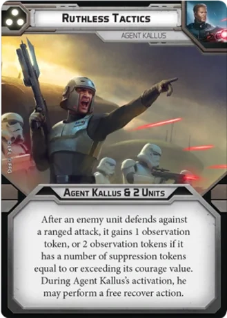 The T-21A pairs well with this card since you’ll have little difficulty in matching your opponent’s courage value. This is a softer/weaker version of coordinated fire, but it’s nice that you aren’t forced to shoot with your corps units first to power up the Range Troopers. The ambiguity of “units” on both Kallus’s 1 and 2-pips is another boon that could open up the viability of bringing Aggressive Tactics on Kallus.