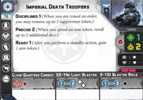 It seems quite incongruous for Range Troopers to drop in the state they have while accompanied by Clone Commandos. In many ways, Clone Commandos show us what proper playtesting (and listening to playtesters) should produce. Clonemandos, while strong, require forethought during deployment. Unlike Range Troopers their range 3-4 weapons exhaust. Rather than having Armor 1, their shields need to be recovered. Instead of being the paragon of movement that Range Troopers are, they are reliant on Complete The Mission tokens and recover actions that make them incredibly static. Instead of Indomitable, they’re only Courage 2 and vulnerable to being suppressed. Instead of getting an aim just for shooting(Advanced Targeting), Clonemandos need to receive an order to get that token (Target 1). In short, they HAVE counter-play.