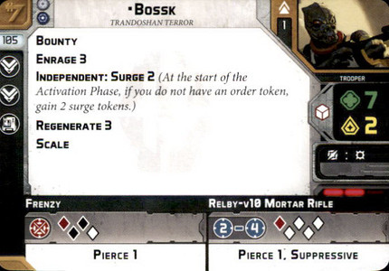 The threat of Bounty can influence your opponent’s strategy/deployment for your benefit and Bossk’s rifle is valuable even if you never consider bounty hunting. Both his two and three pip command cards double down on his ability to force your opponent to roll saves and I dream of the day I can Fire Support “Lying In Wait.” Bossk can melt if exposed to fire, but the long range capabilities of his Relby Rifle means you shouldn’t have to expose him unless you’re seeking that Bounty.