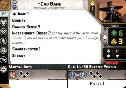 It’s both strange and neat that Cad can be an absolute monster in one faction and a terrible choice in another. Unlike the Confederacy, the Collective has very little order control through the ordering of tokens. Most Collective lists have a bag full of corps tokens and one or two commanders. Throwing an operative like Bossk into this mix is “ok” because he’s shooting from range four and usually embedded within your army or running a flank against a single enemy unit. With Bossk it’s relatively easy to be timing neutral in your activation, but with Bane timing is everything. Since everyone wants to be Independent, Cad’s token is often floating in a sea of uncertainty while you hope that you can pull his token when you need it.